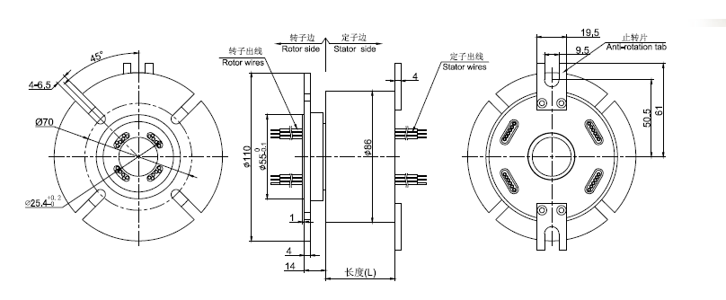 • · 轉(zhuǎn)子帶法蘭, 通孔直徑為25.4mm(適用于<=25.4mm)的標(biāo)準(zhǔn)系列空心法蘭導(dǎo)電滑環(huán)。*注意:如需<25.4mm的內(nèi)孔,可通過(guò)加內(nèi)襯軸套解決。