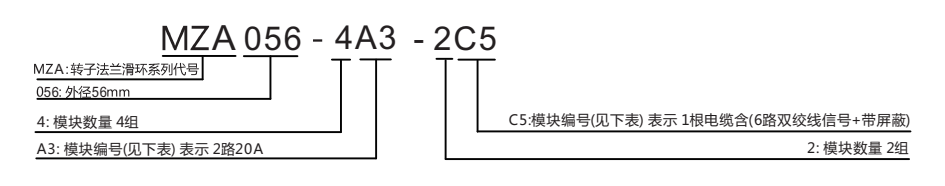 *比如MZA056-4A3-2C5, 其中4A3-2C5是指:4組2路20A(即8路20A)+2組1根電纜含(6路雙絞線信號(hào)+帶屏蔽)