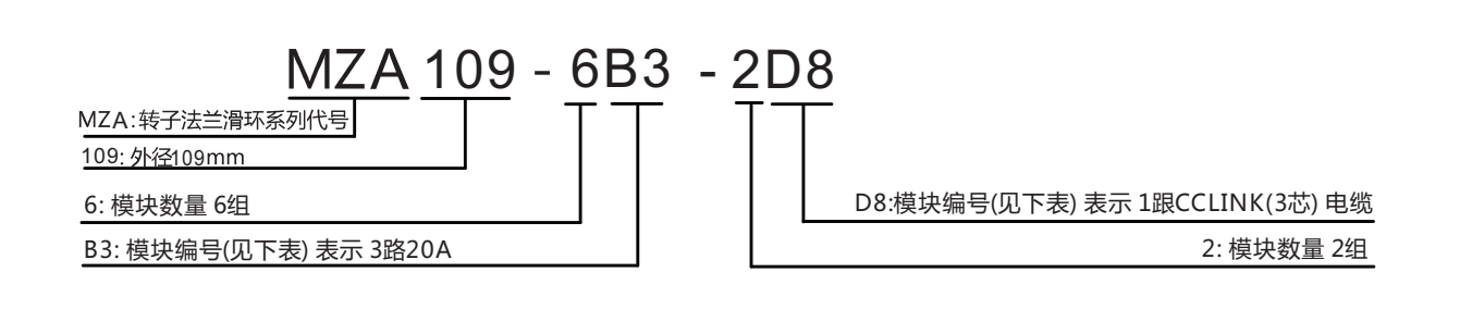 *比如MZA109-6B3-2D8, 其中6B3-2D8是指:6組3路20A(即18路20A)+2組1根CCLINK(3芯)電纜
