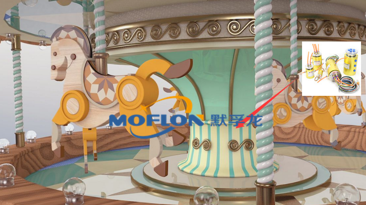 以安裝一部簡易的旋轉木馬為例,默孚龍科技設計時在其中心軸上使用五道滑環(huán)及碳刷,其中三道接三相電機,兩道接220V照明。其中滑環(huán)在其中起到傳輸電流和避免線路纏繞的關鍵作用,大大的增加了旋轉木馬的使用壽命。